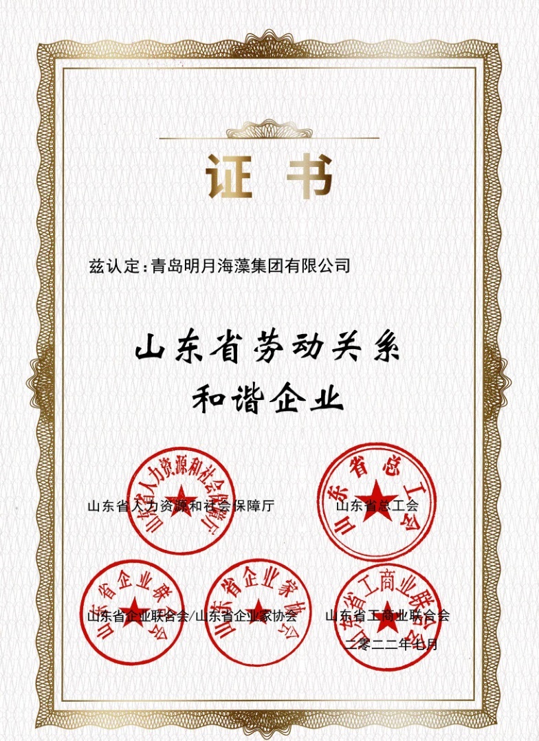 4月27日 明月海藻集團獲評"山東省勞動關系和諧企業(yè)"。并授牌。
