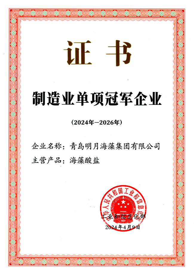 4月,明月海藻集團獲2024-2026年國家制造業(yè)單項冠軍企業(yè)。
