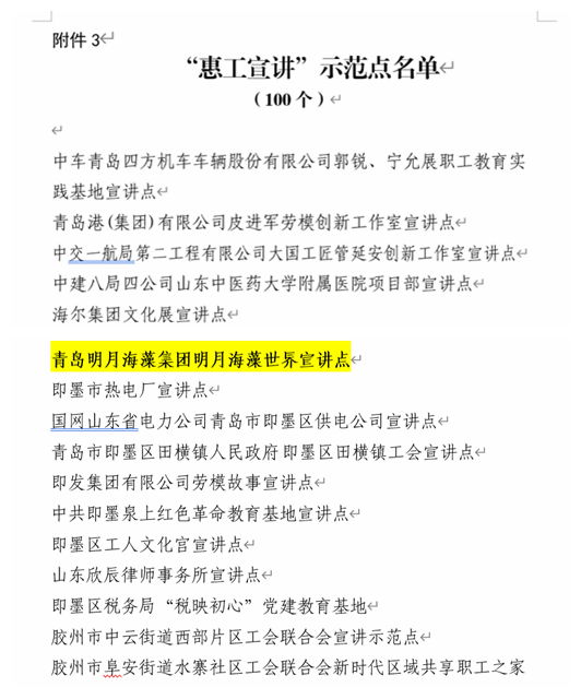 據(jù)了解,為深入貫徹落實(shí)習(xí)近平新時(shí)代中國特色社會(huì)主義思想,貫徹習(xí)近平總書記關(guān)于工人階級(jí)和工會(huì)工作的重要論述,加強(qiáng)和改進(jìn)新時(shí)代職工思想政治引領(lǐng)工作,自2022年以來,青島市各級(jí)工會(huì)聚焦迎接、學(xué)習(xí)、宣傳黨的二十大,廣泛搭建提升職工思想道德文化素質(zhì)的學(xué)習(xí)實(shí)踐平臺(tái),不斷提高職工思想政治工作科學(xué)化規(guī)范化制度化水平,增強(qiáng)工作針對(duì)性實(shí)效性,現(xiàn)共從全青島市范圍內(nèi)評(píng)選出10個(gè)職工思想政治教育實(shí)踐基地、100個(gè)“惠工宣講”示范點(diǎn),我集團(tuán)的“明月海藻世界”和“明月海藻世界宣講點(diǎn)”以絕對(duì)優(yōu)勢(shì)分別榮獲這兩項(xiàng)殊榮。