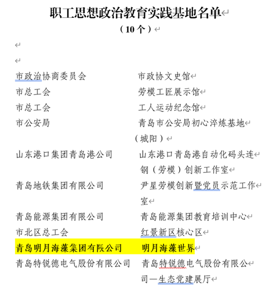 3月9日,從青島市總工會(huì)獲悉,青島明月海藻集團(tuán)的“明月海藻世界”被評(píng)選為青島市職工思想政治教育實(shí)踐基地;“明月海藻世界宣講點(diǎn)”被評(píng)為青島市“惠工宣講”示范點(diǎn)。
