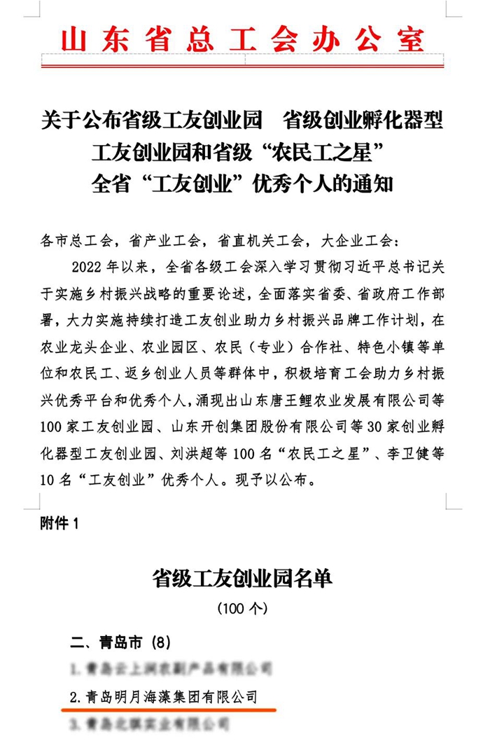 近日,山東省總工會下發(fā)《關(guān)于公布省級工友創(chuàng)業(yè)園、省級創(chuàng)業(yè)孵化器型工友創(chuàng)業(yè)園、省級“農(nóng)民工之星”和全省“工友創(chuàng)業(yè)”優(yōu)秀個人的通知》,青島明月海藻集團成功入選省級工友創(chuàng)業(yè)園。