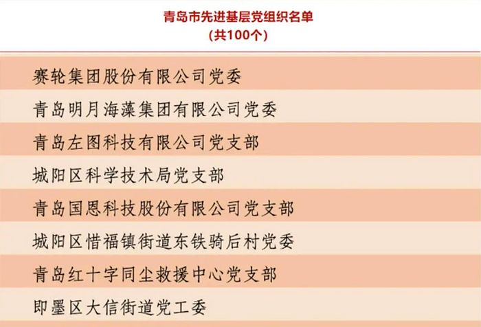 日前,《中共青島市委關于表彰青島市優(yōu)秀共產黨員、優(yōu)秀黨務工作者和先進基層黨組織的決定》發(fā)布,青島明月海藻集團有限公司黨委榜上有名,獲評“青島市先進基層黨組織”稱號。