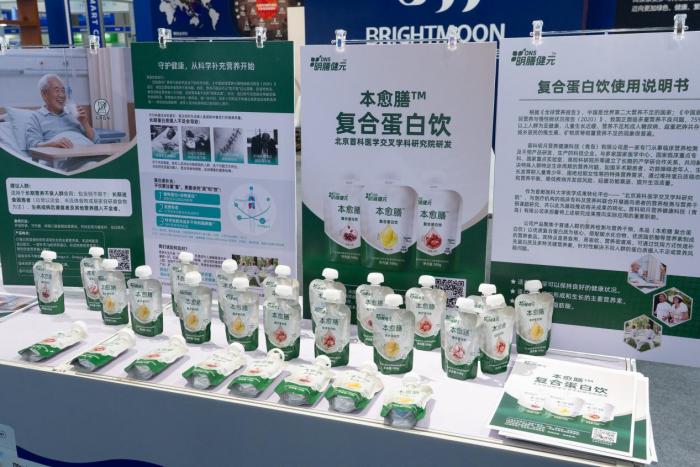 全新推出的明膳健元ons系列產品—本愈膳?復合蛋白飲也在本次展會中首次亮相。由北京首科醫學交叉學科研究院研發,聚焦于普通人群的營養檢測與營養干預。以優質復合蛋白質為核心,搭配碳水化合物、優質脂肪酸等營養素,易食用、易吸收、營養密度高,可通過飲用方式快速補充蛋白質及多種關鍵營養素。深受現場消費者青睞,成為現場的“明星產品”。