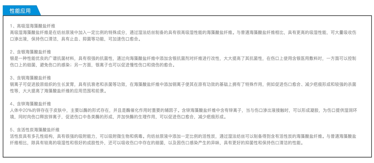 在普通海藻酸鹽纖維生產(chǎn)工藝的基礎(chǔ)上,通過向紡絲原液中添加各種活性成分,包括銀、銅、鋅、活性炭等,以達到對海藻酸鹽纖維改性的目的,提高了其各項性能指標,具有更廣闊的應(yīng)用前景和更優(yōu)異的護理效果。
